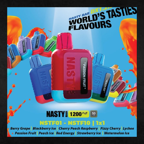 The Nasty Bar 1200 is a single-use, non-rechargeable disposable vape that offers approximately 1,200 puffs and a 50mg (5%) nicotine salt strength. It is known for its strong and consistent flavour delivery across various fruity and icy profiles.