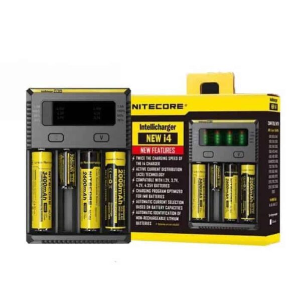Product IntroductionNitecore New I4 battery charger is a universal, smart-charger compatible with almost all types of rechargeable batteries. It is a new version of I4. You can charge at up to 1.5A in one slot, which halves your waiting time.Features:Capable of charging 4 batteries simultaneously100% charging accelerationActive current distribution technologyExpanded compatibility to support 3.7V and 4.35V batteriesIMR battery restorationAutomatic detection of non-rechargeable batteriesAutomatic current selection based on battery capacityAutomatic adoption between three charging modes (CC, CV, and dV/dt): Optimal -dV/dt charging for Ni-MH/Ni-Cd batteries and charging program optimized for IMR batteriesReverse polarity prevention and short circuit preventionOvercharging timeout protection and over-discharged battery activationAutomatic intelligent temperature control and protectionUncluttered and concise design, artisan craftsmanship and comprehensive power compatibility,Compatible with 1.2V, 3.7V, 4.2V, 4.35V batteriesThe terminating threshold for battery voltages and charging current can be set independently for each individual slotAutomatically detects battery power status and displays charging progressDesigned for optimal heat dissipation, made from fire-resistant, flame retardant PC materials, certified by RoHS, CE, FCC, and CECBatteries not included.Specifications:140mm x 94.8mm x 37mmInputAC 100~240V 50/60Hz 0.25mA(max) 10WDC 9~12V 1AOutput4.35V±1%/4.2V±1%/ 3.7V±1%/1.48V±1%1.5A×1/0.75A ×2/0.5A ×2/0.375A ×4Compatible withLi-ion/IMR/LiFePO4:10340, 10350, 10440, 10500, 12340, 12500, 12650, 13450, 13500,13650, 14350, 14430, 14500, 14650, 16500, 16340(RCR123),16650, 17350, 17500, 17650, 17670, 18350, 18490, 18500,18650,18700, 20700, 21700, 22500, 22650, 25500, 26500, 26650Ni-MH(NiCd):AA, AAA, AAAA, C, D